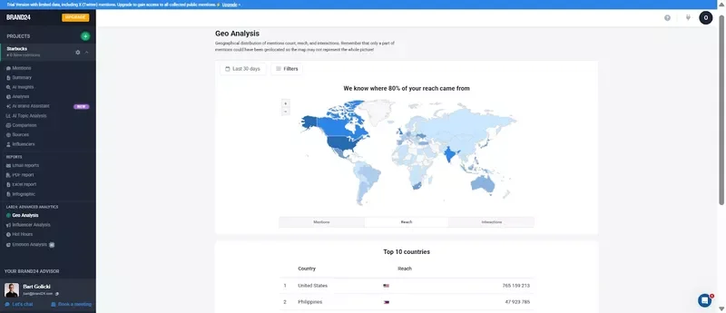 Want to know where your brand is making waves? Geo Analysis gives you a map and table view of your top 10 countries by mentions, reach, and engagement. You can filter results by source (Instagram, blogs, Facebook), sentiment, influence score, and language to get actionable, localized insights to guide your next move.