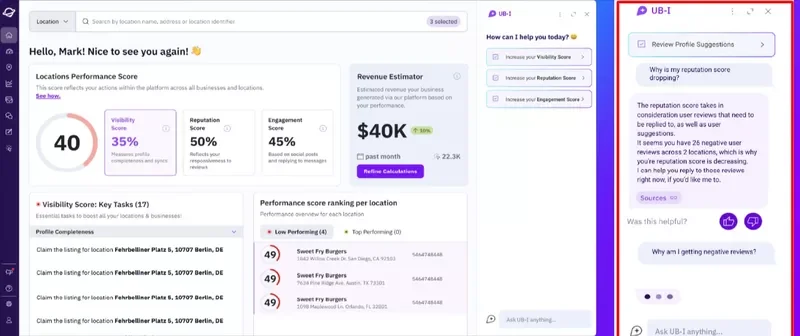 Uberall helps you monitor, respond to, and analyze reviews from across review sites like Yelp, Google Business Profile, and TrustPilot, all in one place. What sets it apart is UB-I—its AI-powered location performance optimizer.