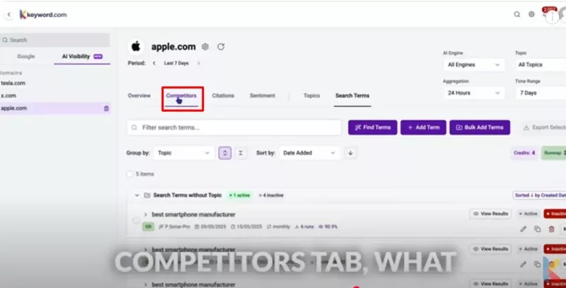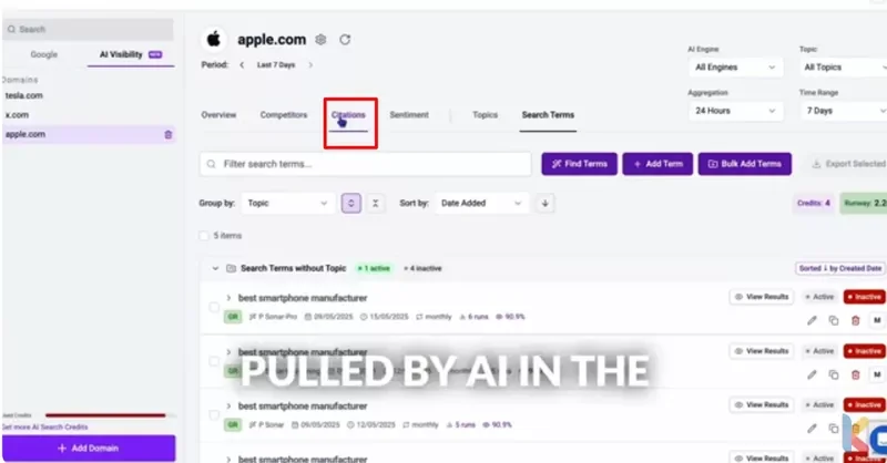 Keyword.com has a dedicated citation tab that shows detailed data on which of your and your competitor’s pages get referenced in AI answers.