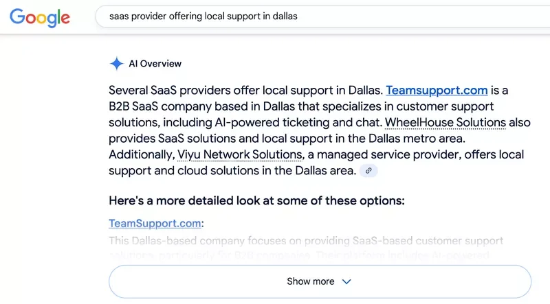 Queries have also become layered and conversational. A search like “IT support Dallas” has evolved into “Which IT companies in Dallas offer HIPAA-compliant support and 24/7 on-site service?” These queries combine multiple attributes—industry requirements, availability, and location.