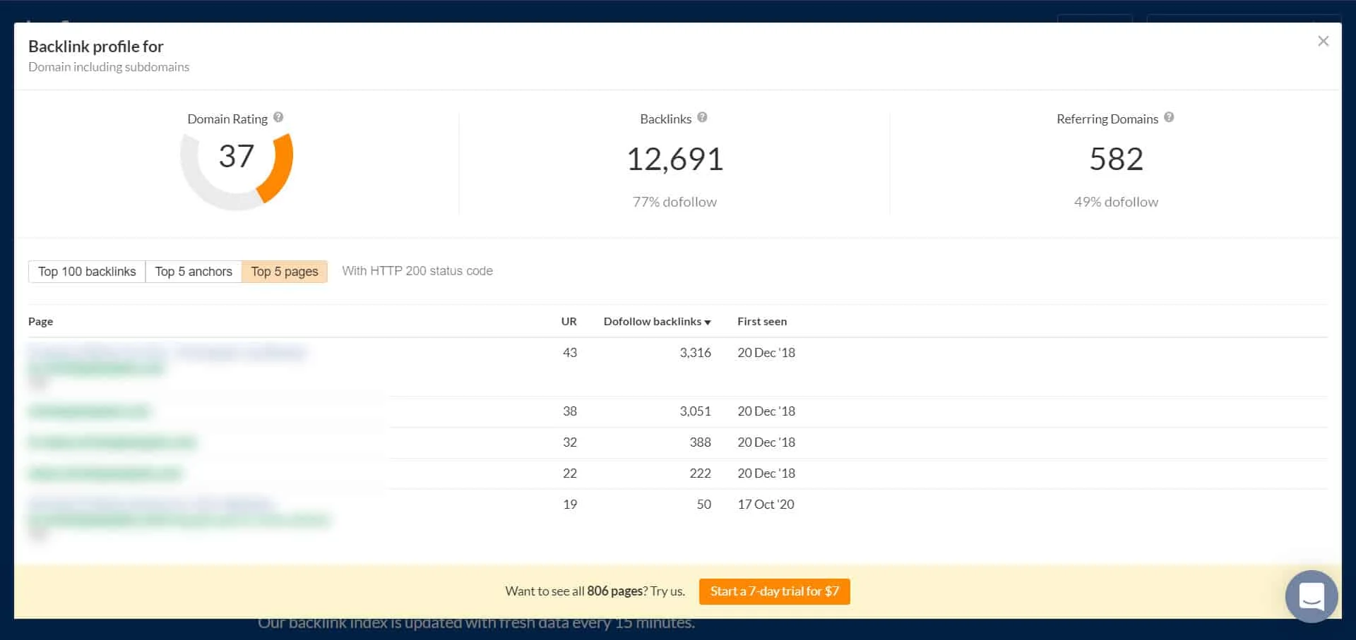 To do this, go to Backlink profile > Referring domains after entering your site’s URL on Site Explorer. Then reorder the site to show website with the lowest DR on top by clicking on the DR column.