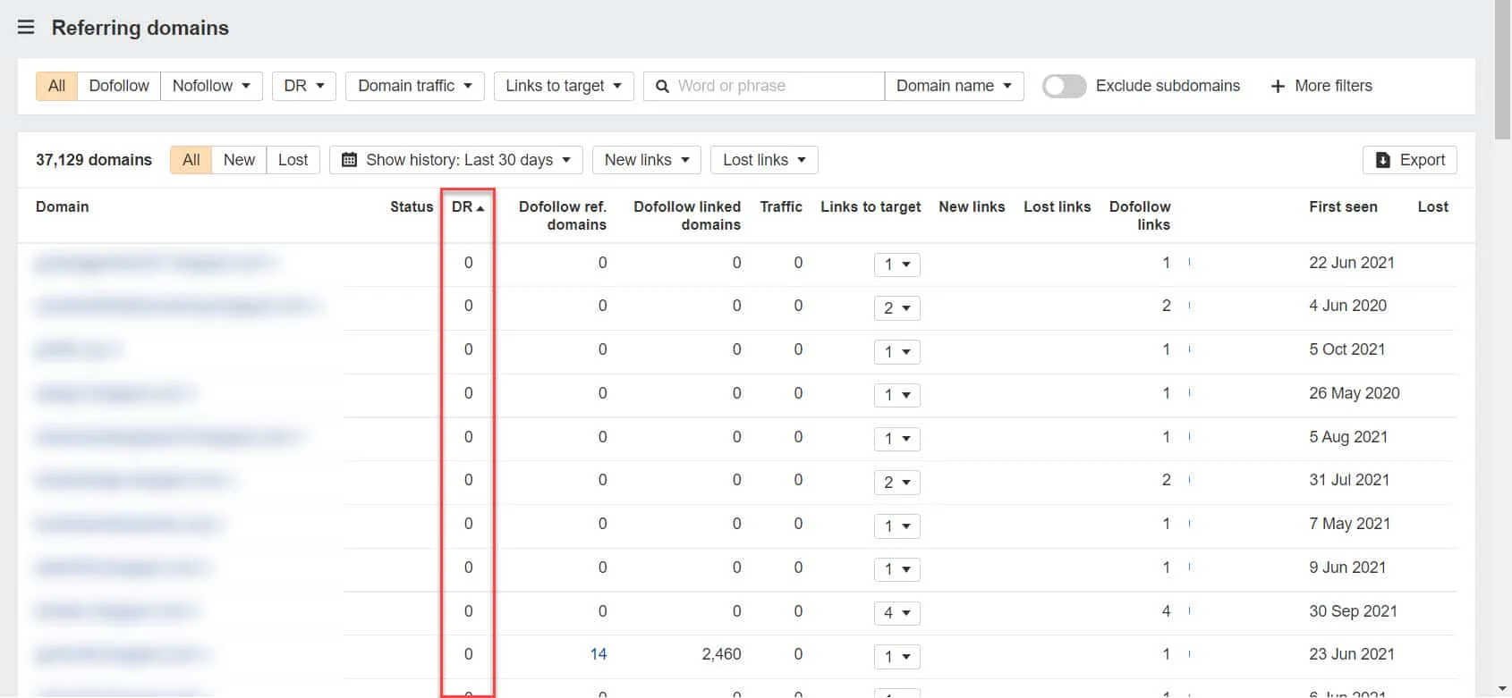 You should see websites with DR 0. This could mean the sites are spammy or are brand-new. Even if the sites are brand new, it’s possible that they could end up being authoritative in the long run.