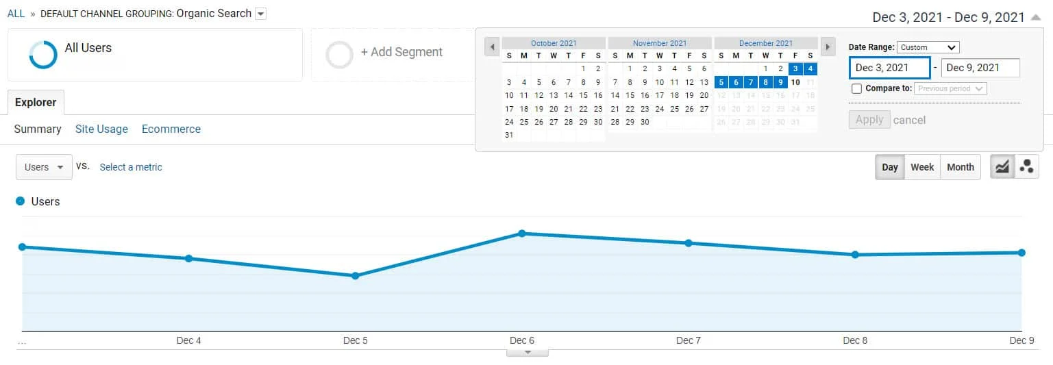 You can also break down organic traffic for each day, week, or month. Adjust the date range to compare your SEO progress for before and after your SEO campaign.