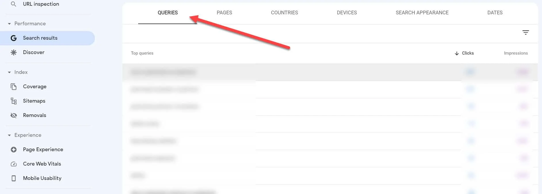 Inside search console, you can see the top queries users typed in to find your site on search results. Clicking on the Queries tab will show you the keywords with the most clicks and impressions.