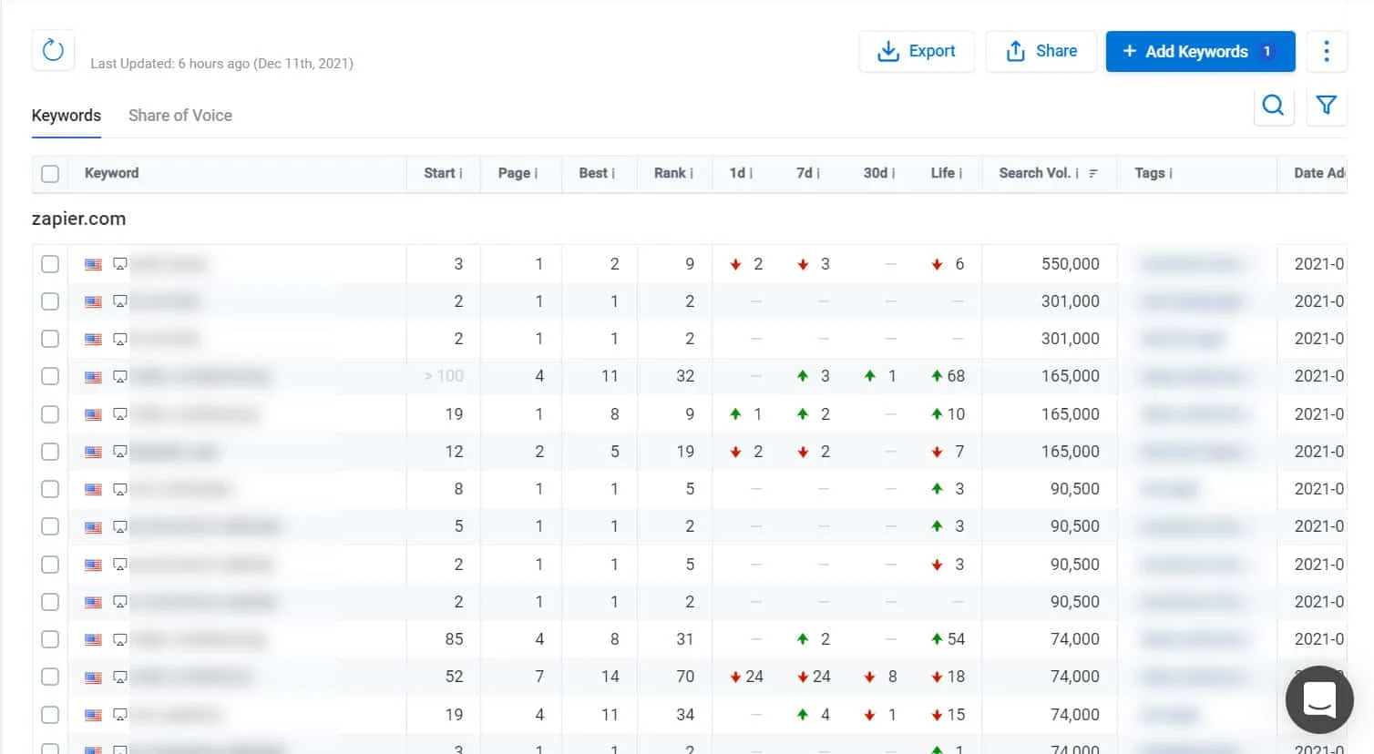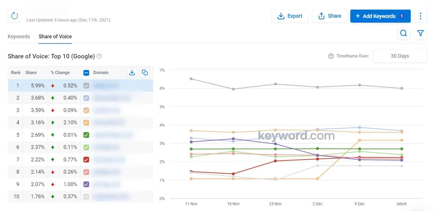 The tool’s SEO Share of Voice measurement feature compares your overall ranking against other competitor websites vying for the same keywords as you.