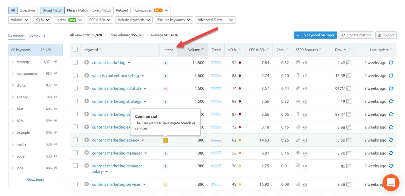 To help you determine the intent of the keywords you’re researching, SEMrush shows you this data in its Keyword Magic Tool feature.