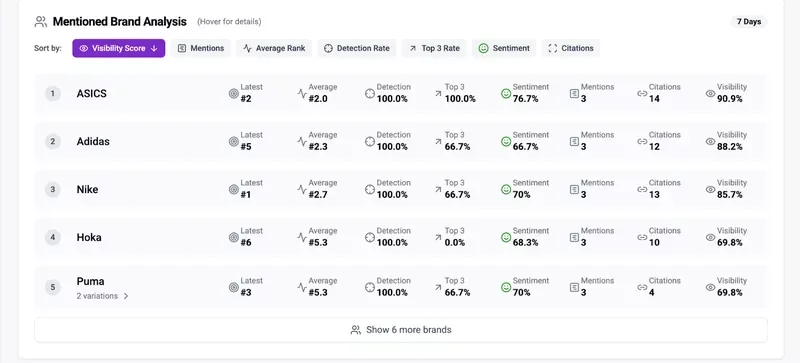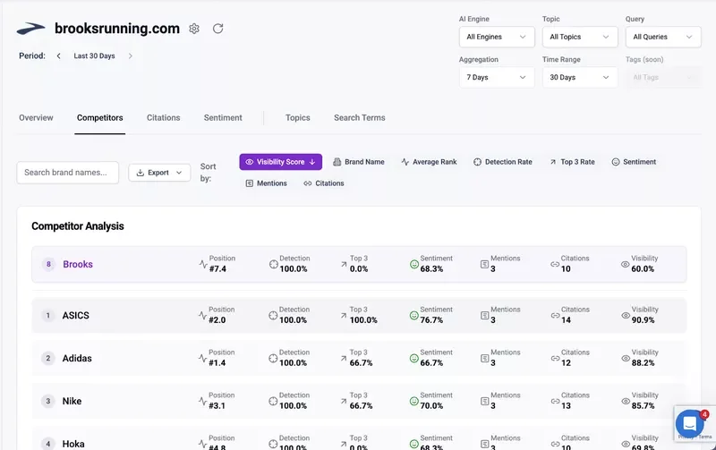 - Top 3 Visibility percentage: How often you show up in the top 3 AI answer spots
