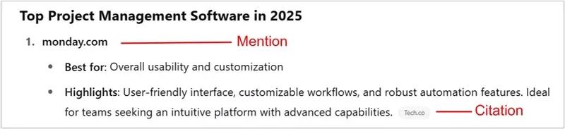 Citations, on the other hand, are direct references or links to your website. They’re the AI-era version of backlinks, signaling authority and source credibility.