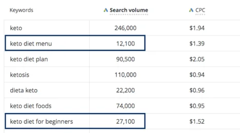What do you think gets more search volume? “Keto diet menu” or “keto diet for beginners”? You might be tempted to think that “keto diet menu” gets more search queries because it’s shorter, but “keto diet for beginners” has more than twice the search volume.