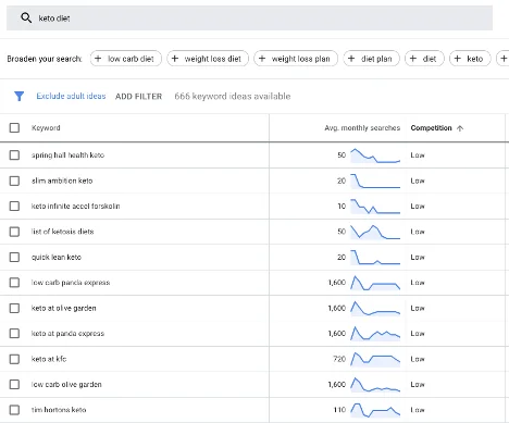 For example, the phrase “keto diet” shows 222,000,000 results in Google, making it highly competitive, while “keto at ihop” returns only 600,000 results. Instead of exiling yourself to “no man’s land” in Google’s rankings, it’s a better idea to focus on long-tail keywords that have a more reasonable level of competition.