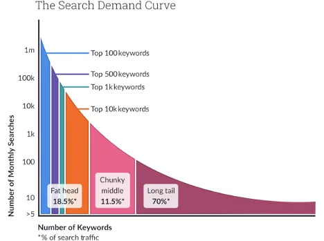 So, as you can see, long-tail keywords get their name because they look like long tails at the end of the search demand curve.