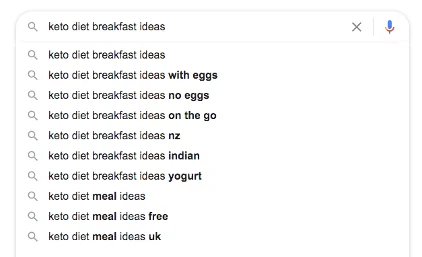 You can even take this one step further by finding long-tail keywords that expand on your additional phrases. For example, if you type “keto diet breakfast ideas” into the search bar, you get even more inspiration.