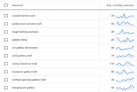 For example, gallery walls are becoming increasingly popular in people’s homes, but there are untapped content opportunities. Let’s say you offer custom gallery wall services or provide tutorials about how to create your own gallery wall, you could potentially rank for keywords like “random photo wall” or “pink gallery wall.”