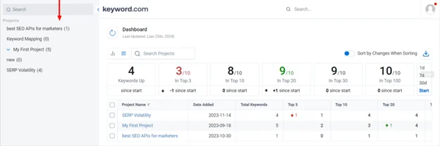To start, sign up to keyword.com and create a new project by clicking the Add Project icon. You can choose any projects from the left drop-down if you already have an account.